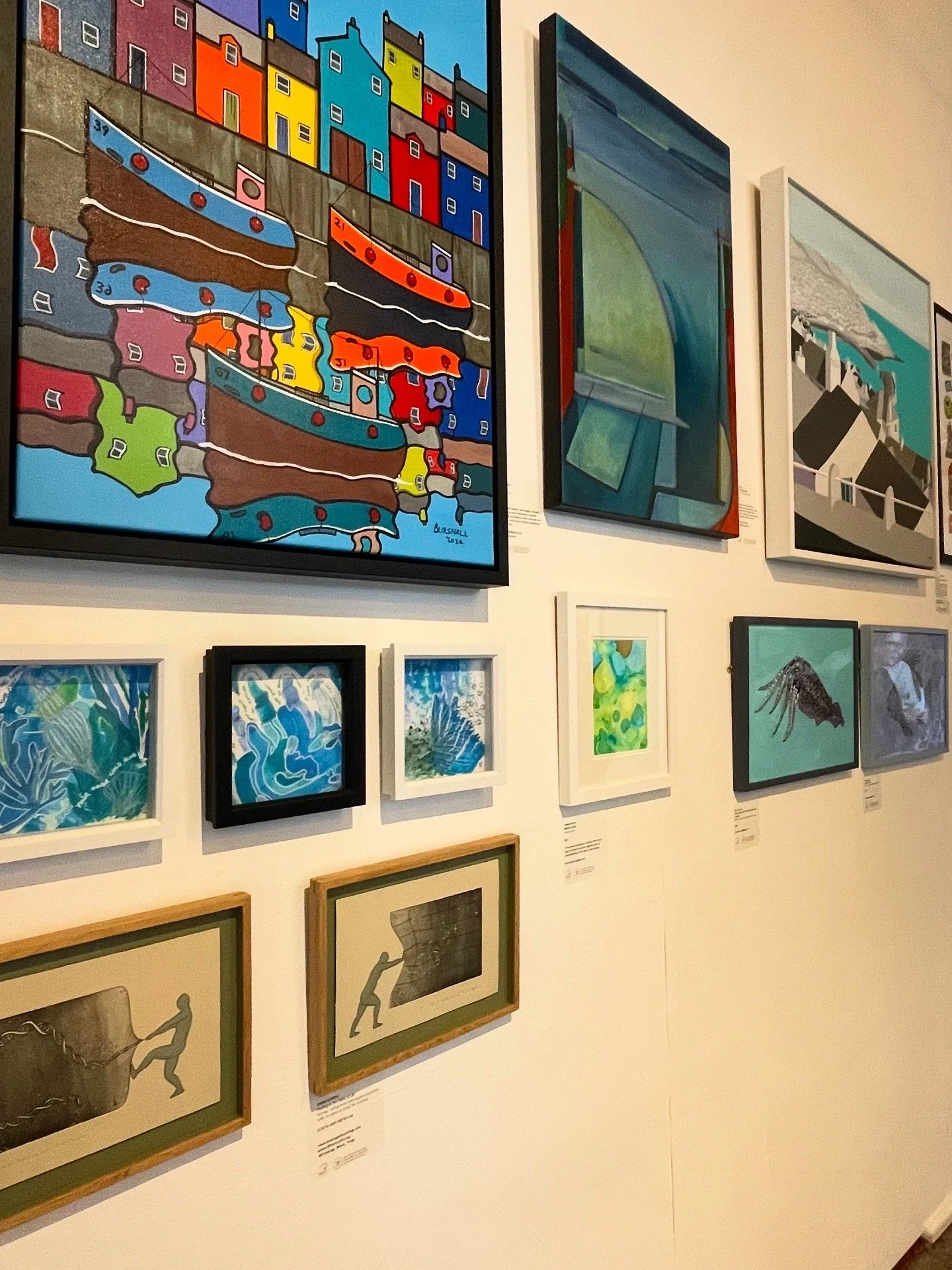 I think that the curation of the Member's show was done very thoughtfully because the colours and textures were complimentary between all the works on each wall space. The subject matters were mostly coastal themed too which was nice. You may notice there was a continuity with the outlines and colours, the patterns, the size of the works and the frame choices.